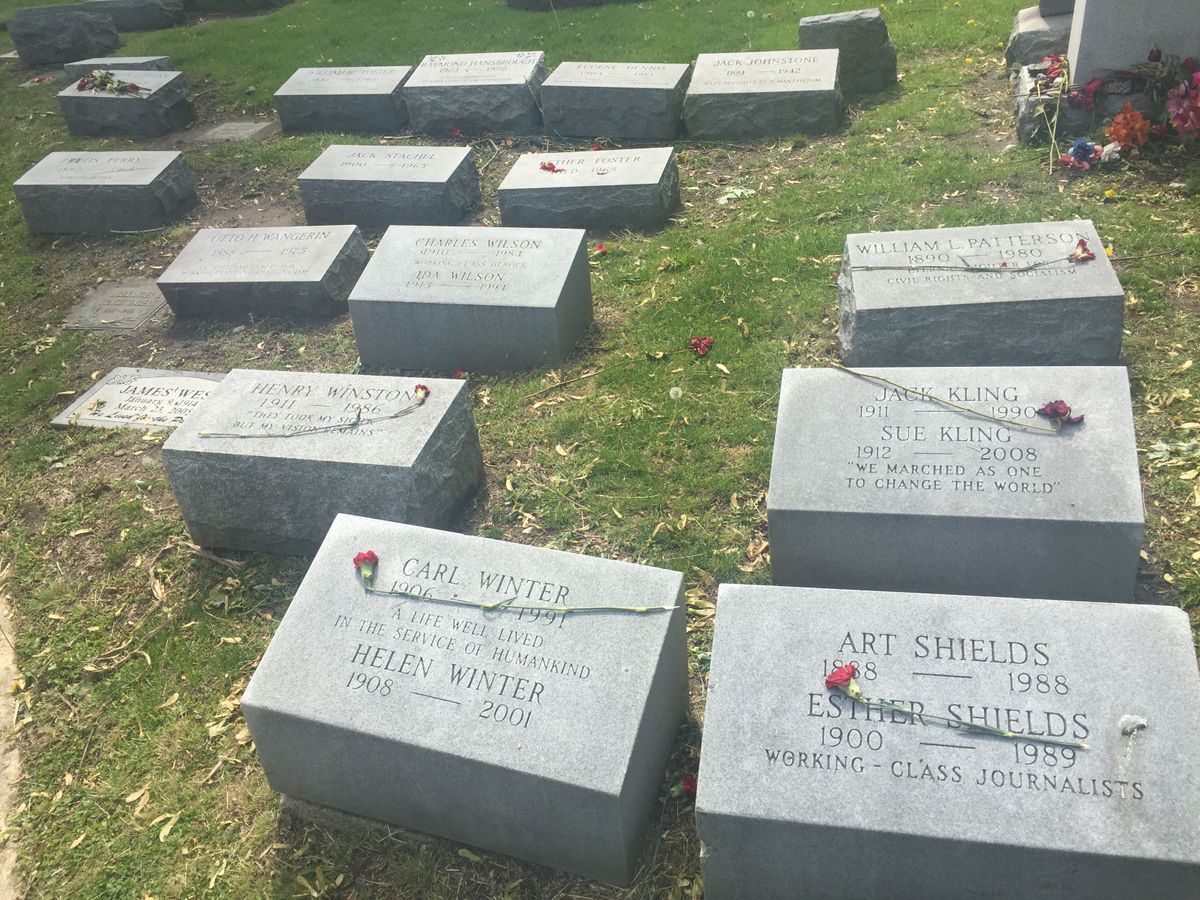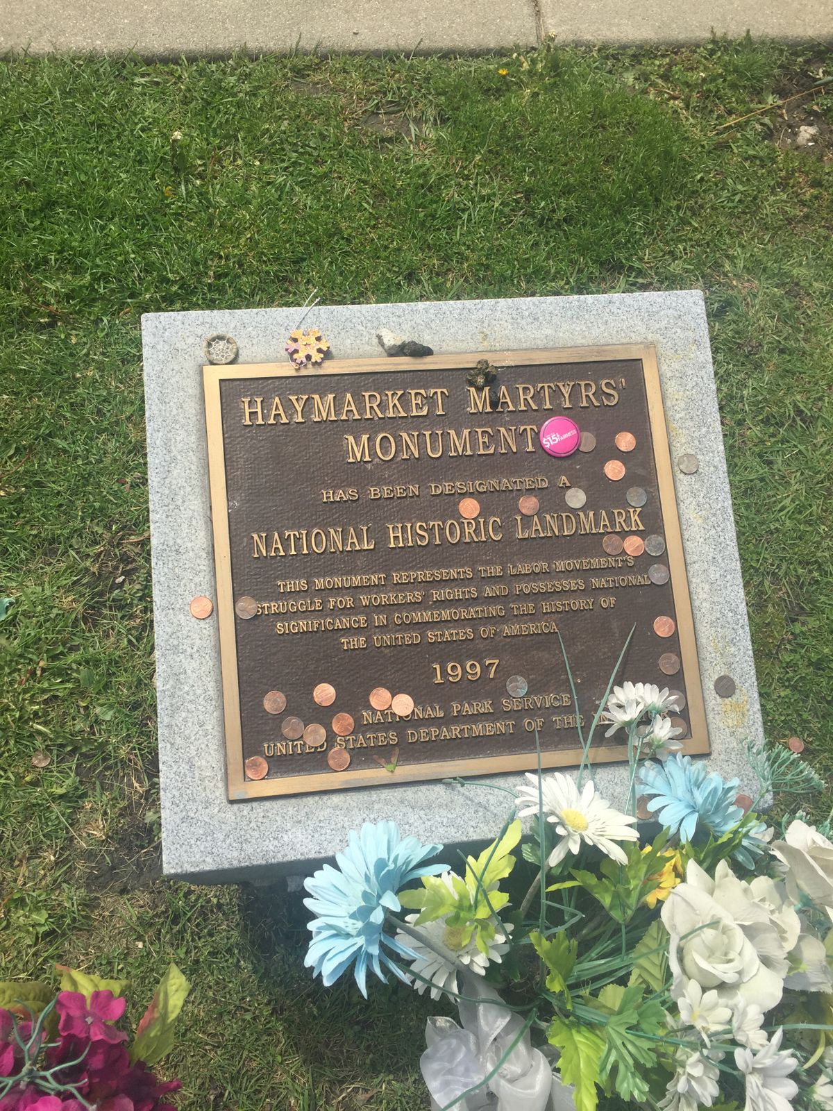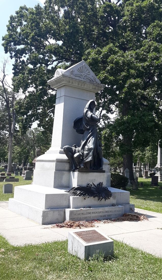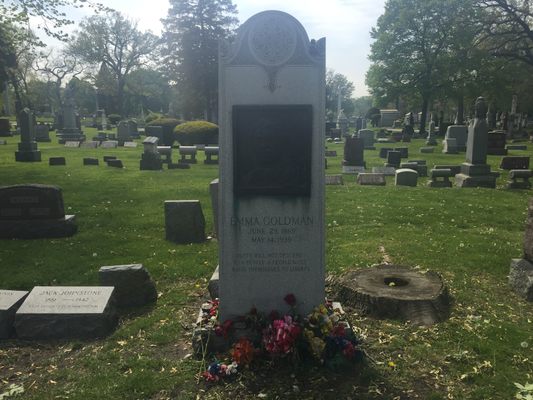 An unintended effect of the monument was the desire for labor activists, radicals, and anarchists to be buried close by. Next to the monument is a series of grave sites referred to as “Radical Row.” There you will find the markers of notable activists such as Elizabeth Gurley Flynn, Lucy Parsons, and Sylvia Woods amongst many others. Most notable is the grave of anarchist Emma Goldman. Her tombstone stands out because it's much taller than the others and features a bas relief by sculptor Jo Davidson.