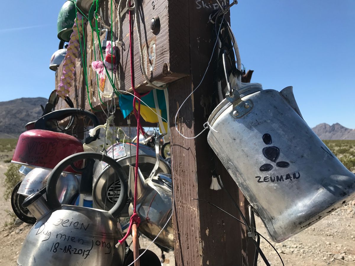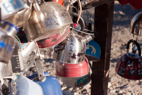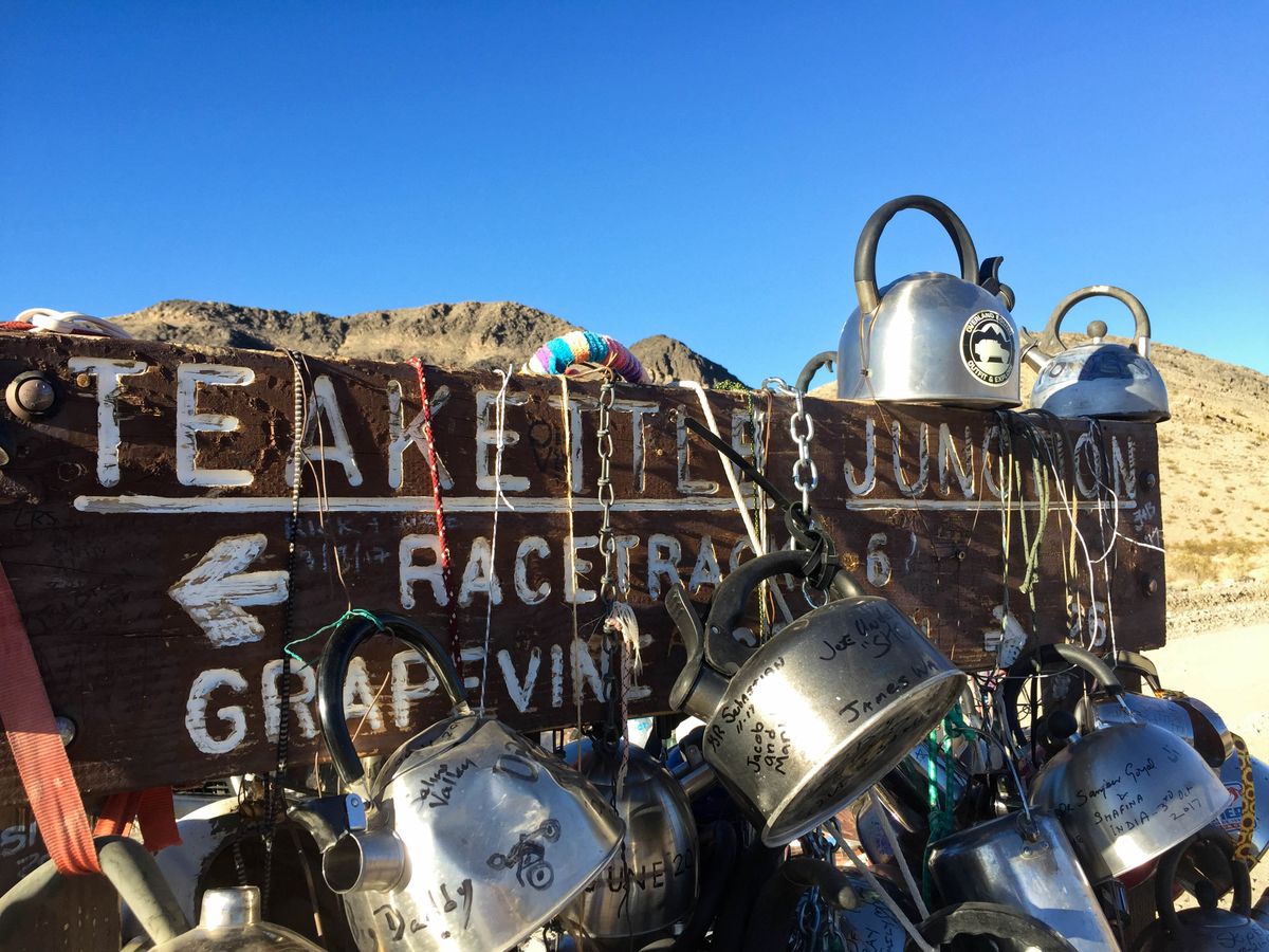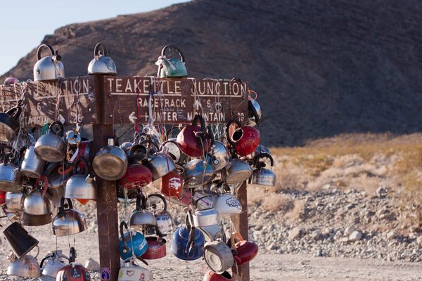 About 20 miles down a bumpy, unimproved road in the Mojave Desert is a strange shrine of sorts. There, in a patch of earth known for its boiling temperatures, you’ll find a sign covered in kettles of all sizes, shapes, and colors that marks an intersection as "Teakettle Junction."