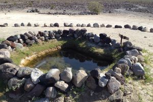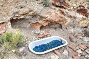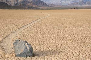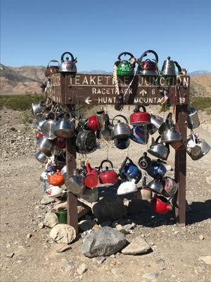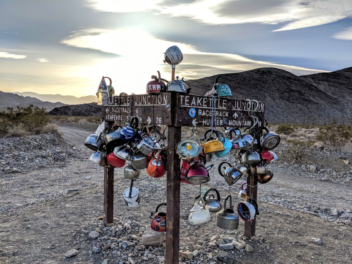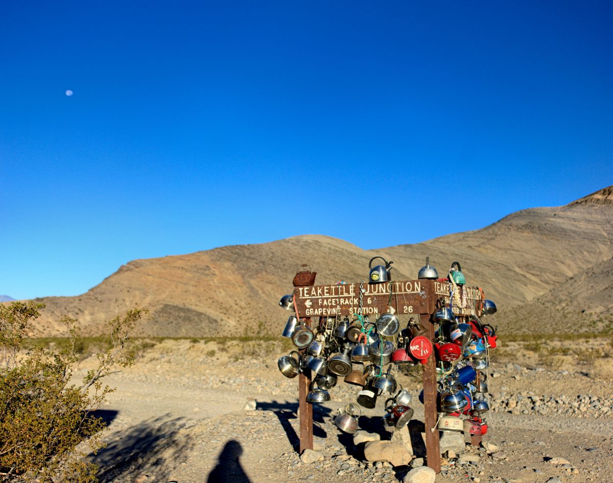 Teakettle Junction is 20 miles down Racetrack Valley Road, an unimproved road in Death Valley National Park. Good tires, a 4x4, and high clearance are usually required to traverse the road; the park service recommends against using standard rental cars. Death Valley is extremely arid and one of the hottest places on Earth, so make sure to bring plenty of water. Cell service is unavailable in the area.
